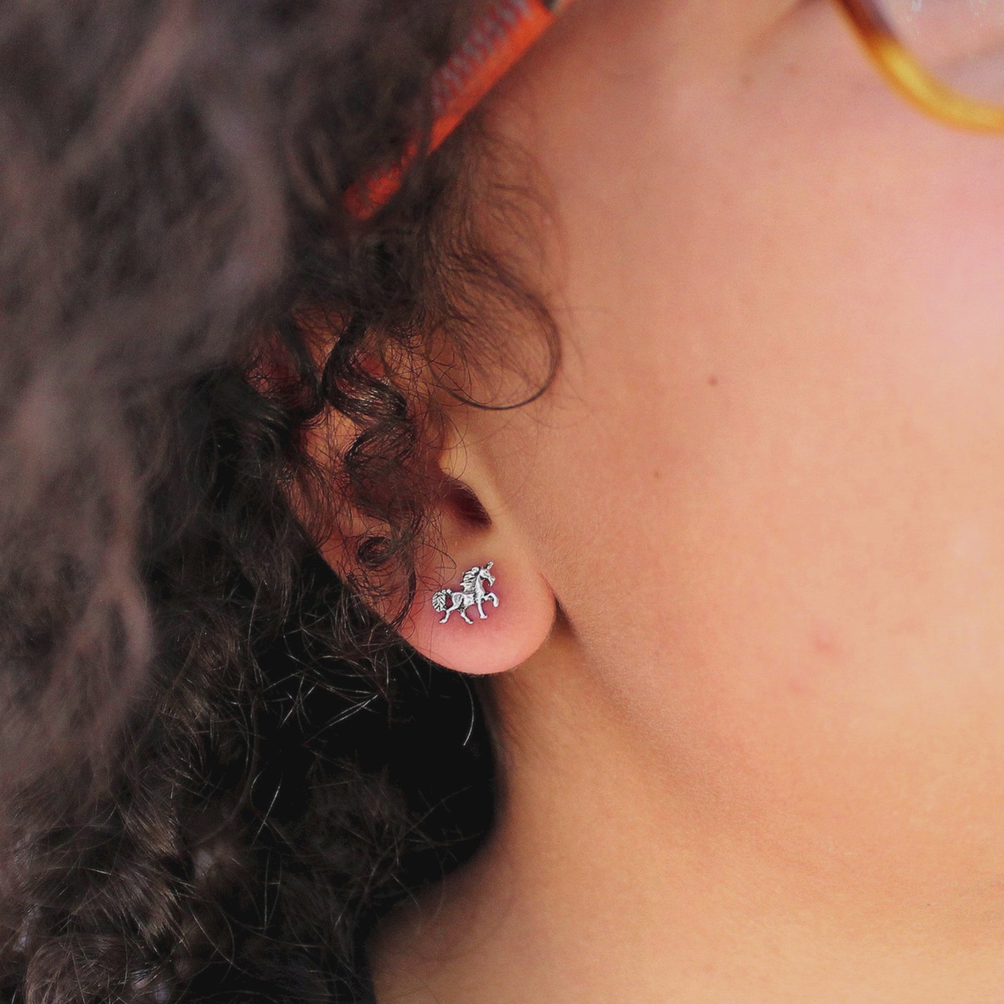 These Unicorn Stud Earrings feature delicate unicorn pendants crafted from Sterling Silver, symbolizing purity, freedom, and imagination. The earrings are polished to a high shine and available in finishes such as Polished Silver, Gold Vermeil, and Rose Gold Vermeil.
